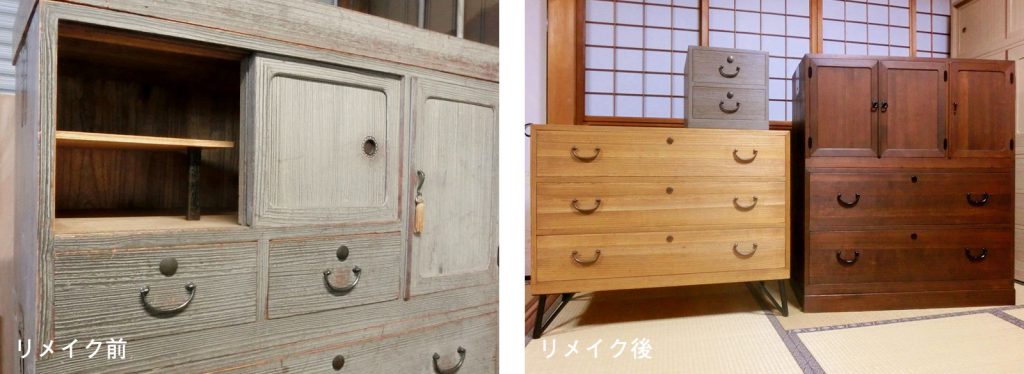 3つに分かれる桐たんすを2つに分けてお使いになられます。上台+下台は、ご家族のアルバムや着物を収納されるということで、使いやすいよう上台の引戸を扉にリメイクしました。 また、妹さまは上台のリメイクによって使われなくなる小引出しの再利用をお考えになり、新たに小引出し箱を製作いたしました。中台はリビングに置いて普段使いの鉄脚付きのチェストとしてお使いになられます。使い方に合わせて、このような色々な形に再生することができ、とても嬉しく思います。