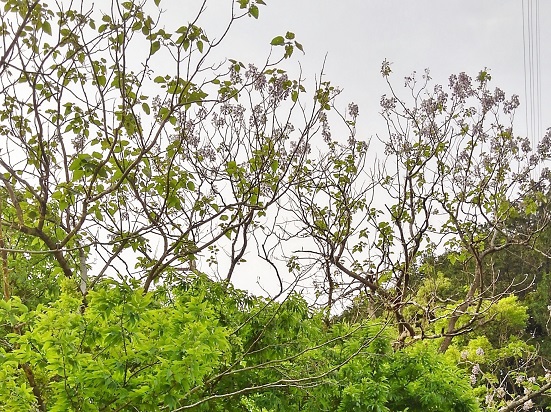 可愛らしいラッパの形をした薄紫色の花を咲かせる桐。